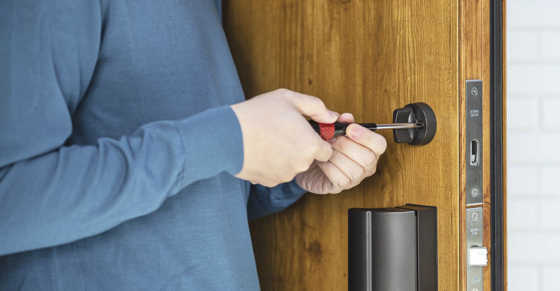 - 実はドアからの侵入はピッキングだけではないのです。室内側のサムターンを直に操作する「サムターン回し」という手口です。特殊な工具などを使ってサムターンを回すので、平らで大きなサムターンほど回しやすくて危険です。美和ロックのスマートロックに標準採用している防犯サムターンは、サムターンの上下にあるスイッチを押し込んだ状態にしないと回らないため、穴や隙間から差し入れた工具でサムターンを回すのは困難です。