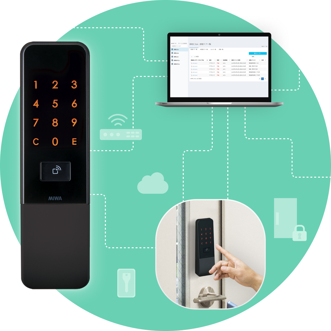 スマートロックの設定や時限式の鍵(暗証番号やURLキー)の発行を行います。パソコン、スマホ、タブレットに対応しています。